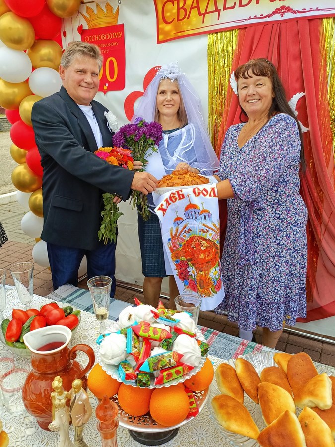 Украшением площадки стала яркая инсценировка свадьбы золотых юбиляров. Подружки невесты, свидетели, весёлая сваха, строгая регистраторша ЗАГСа создавали атмосферу настоящего торжества.